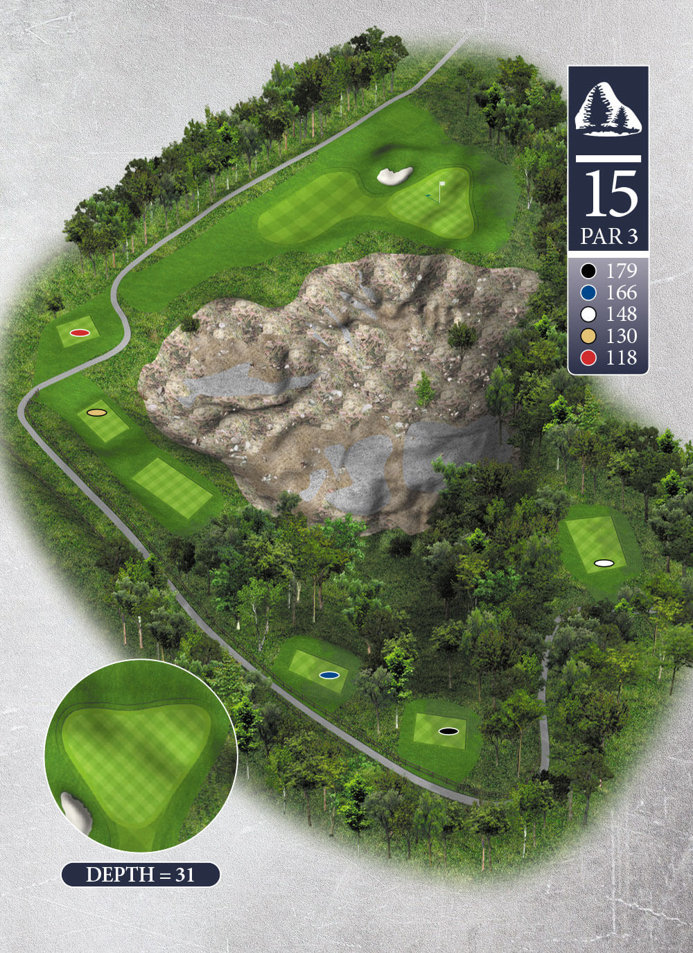 Hole 15 is an intimidating par 3 that requires all-carry over the quarry. Six tee boxes dot the ridge allowing you to pick your poison. There’s some room behind and left of the green, as well as elevated tees which will help to carry your shot a little further. Anything short means the quarry gets to keep your ball.