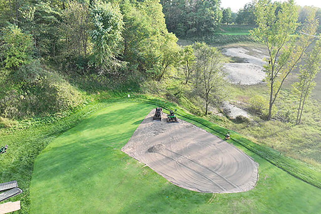 Hole 14 has a fully rebuilt and sodded green. Now back to its original view with the removal of invasive buckthorn, black locust and barberry around the green complex. New exposure to airflow around the green will allow the wind to challenge your approach shot. Are you still going for the green in 2?